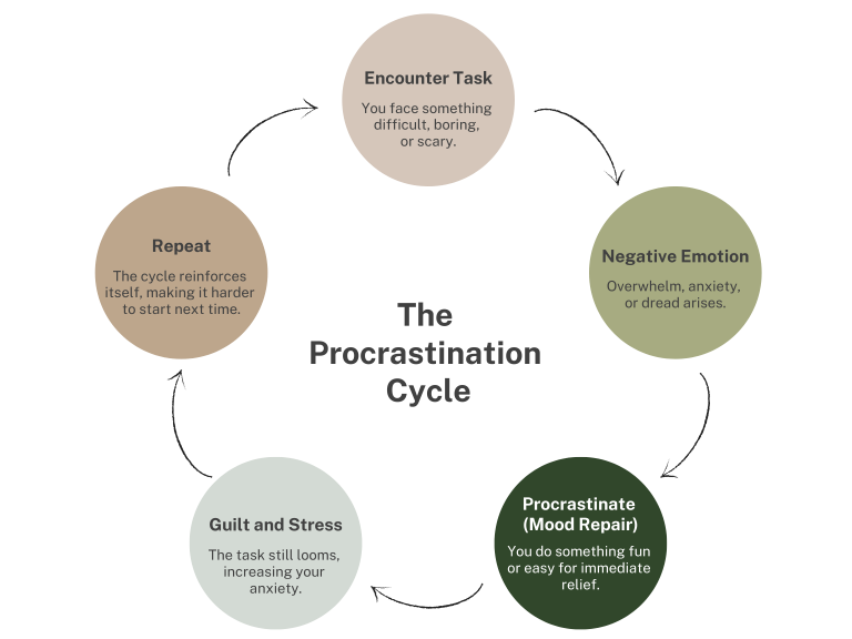 Putting off a task provides immediate relief. Your brain gets a quick dopamine hit from a distraction, which rewards you for avoiding the "scary" or "big" thing.